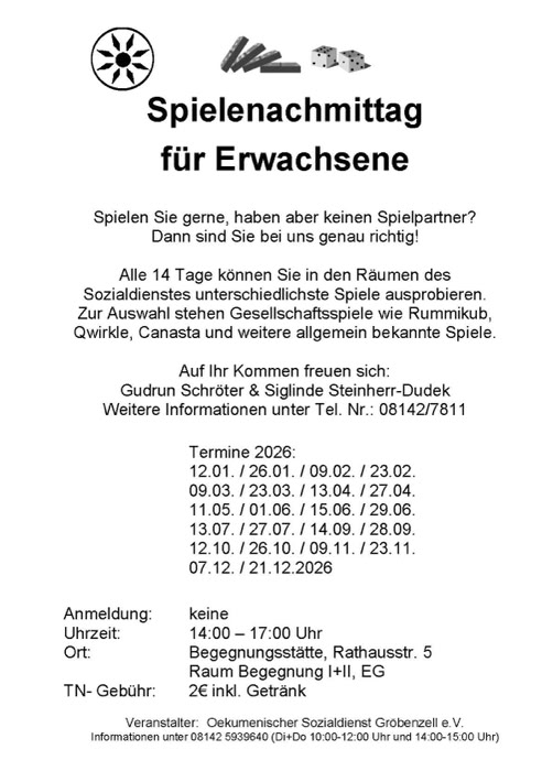 Sie können alle 14 Tage von 14:00-17:00 Uhr (nach Absprache auch in den Ferien) in den Räumen der Begegnungsstätte unterschiedlichste Spiele ausprobieren. Zur Auswahl stehen Gesellschaftsspiele wie Rummikub, Qwirkle, Canasta und weitere allgemein bekannte Spiele.