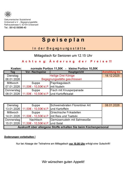 Wir bitten um Anmeldung bis spätestens Donnerstag, 12:00 Uhr, für die jeweils folgende Woche bei der Begegnungsstätte des Oekumenischen Sozialdienstes, Tel. 08142 / 59396-40. Sollten Sie das Mittagessen nicht wahrnehmen können, ist eine kostenlose Stornierung des Essens bis 10:00 Uhr des jeweiligen Tages möglich.
