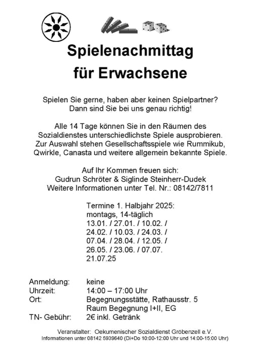 Sie können alle 14 Tage von 14:00-17:00 Uhr (nach Absprache auch in den Ferien) in den Räumen der Begegnungsstätte unterschiedlichste Spiele ausprobieren. Zur Auswahl stehen Gesellschaftsspiele wie Rummikub, Qwirkle, Canasta und weitere allgemein bekannte Spiele.