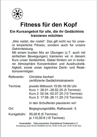 „Wer rastet, der rostet“. Das gilt nicht nur für unsere körperliche Fitness, sondern auch für unsere Gehirnleistung. Mit einem bunten Mix an Übungen (z.B. auch mit einfachen Bewegungen) trainieren wir in diesem Kurs unser Gedächtnis. Dabei fördern wir in lockerer Atmosphäre Konzentration und Ausdrucksfähigkeit sowie unser logisches Denk- und Reaktionsvermögen.